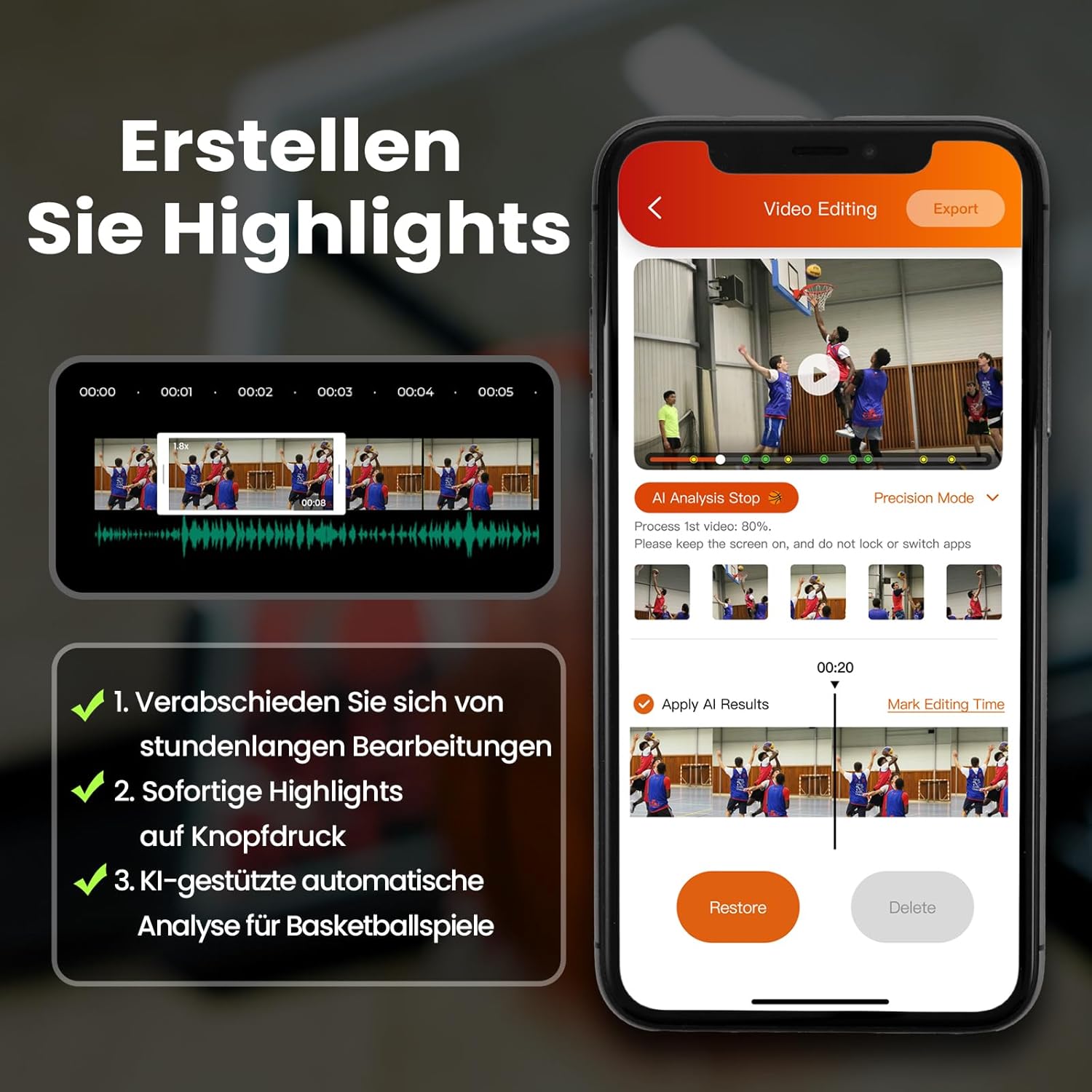 FollowMe-Modus – Verfolgt denselben Spieler von Anfang bis Ende: Der FollowMe-Modus wurde für Basketballtraining und -spiele entwickelt und sorgt dafür, dass die Action Cam während des gesamten Spiels auf einen einzelnen Spieler fokussiert bleibt. Es erfasst wichtige Momente, Bewegungen und Techniken – ideal für Leistungsanalysen, Traineranalysen oder die Erstellung von Highlight-Videos.