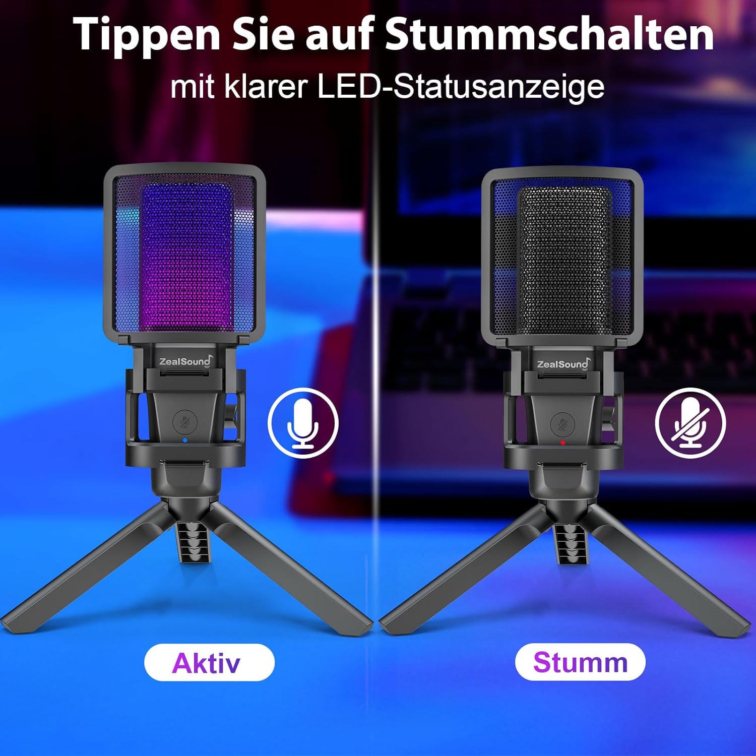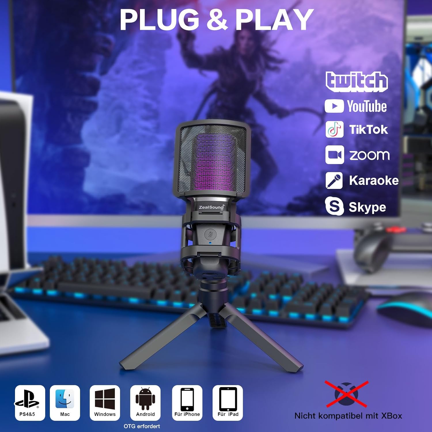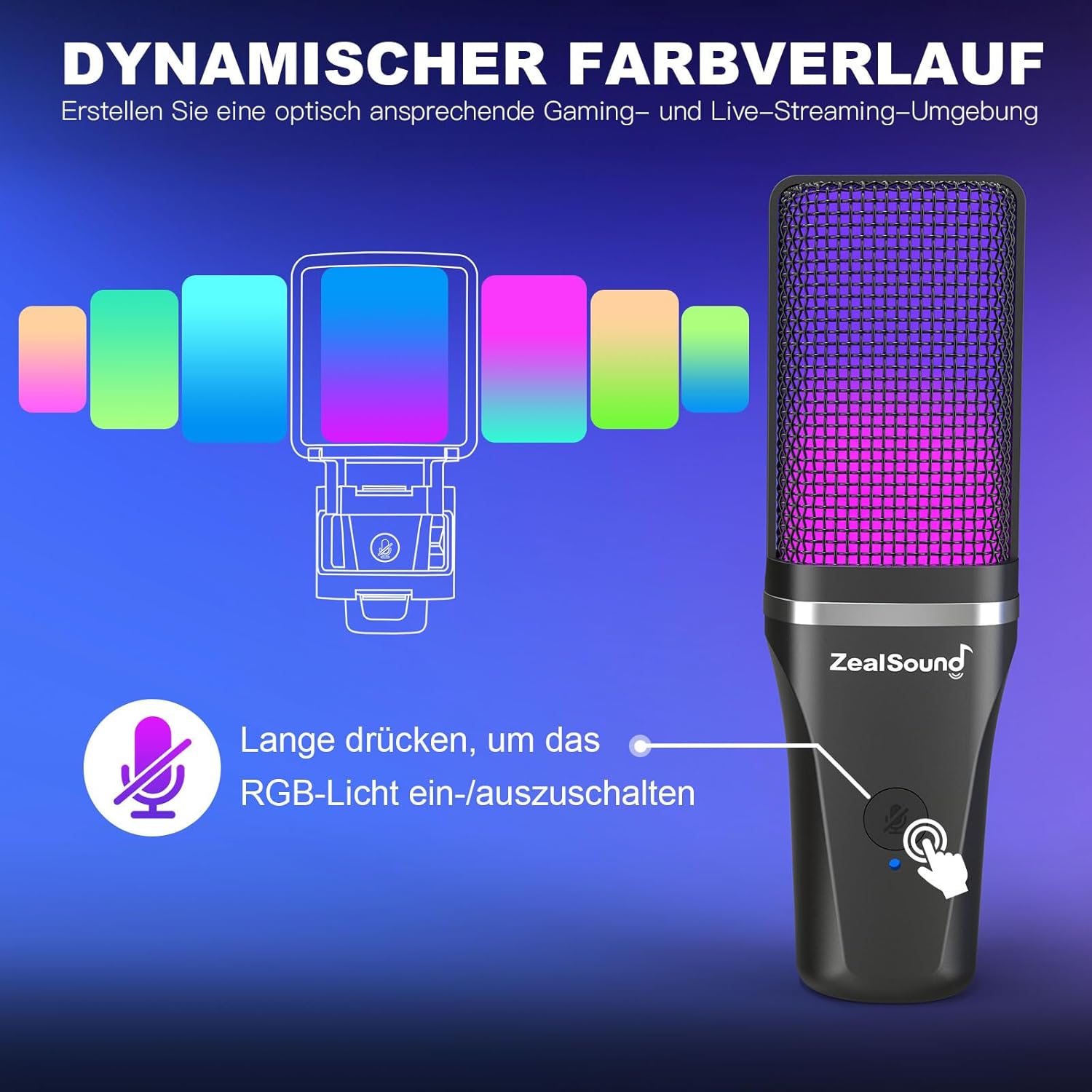 zealsound Gaming USB Microphone PC, for Streaming Podcast Studio, for PS4 PS5 Mac Mobile Phone, with Type-C Adapter, RGB Control, Mute Button, Tripod, Pop Filter & Shockmount, Headphone Jack