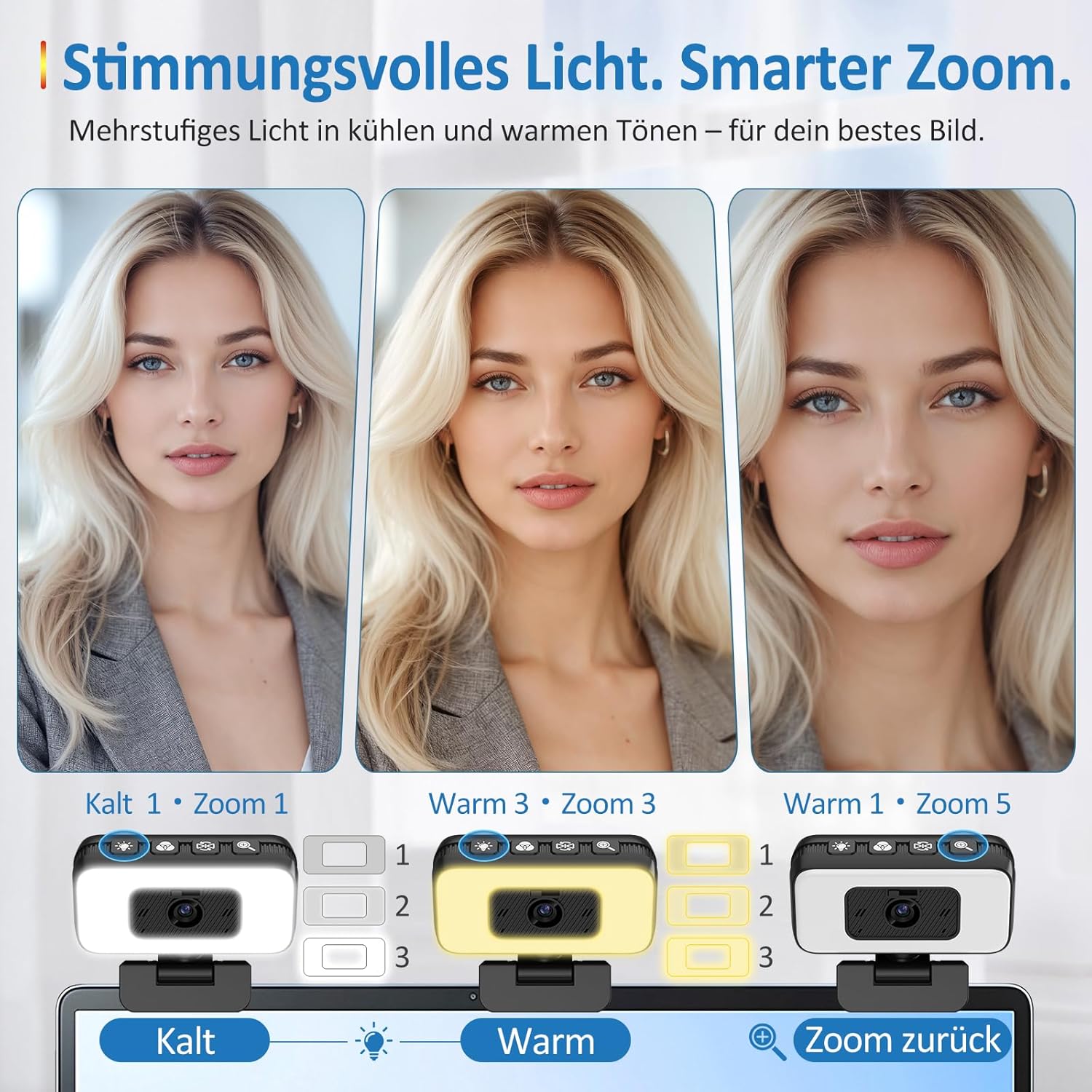 6-stufiges Licht und Multifunktionstasten: Passen Sie Helligkeit, Farbtemperatur, Zoom und Bildausrichtung mit einem Klick an. Die komfortable Steuerung direkt an der Kamera gewährleistet eine flexible Anpassung an jede Umgebung – ohne Softwareinstallation.