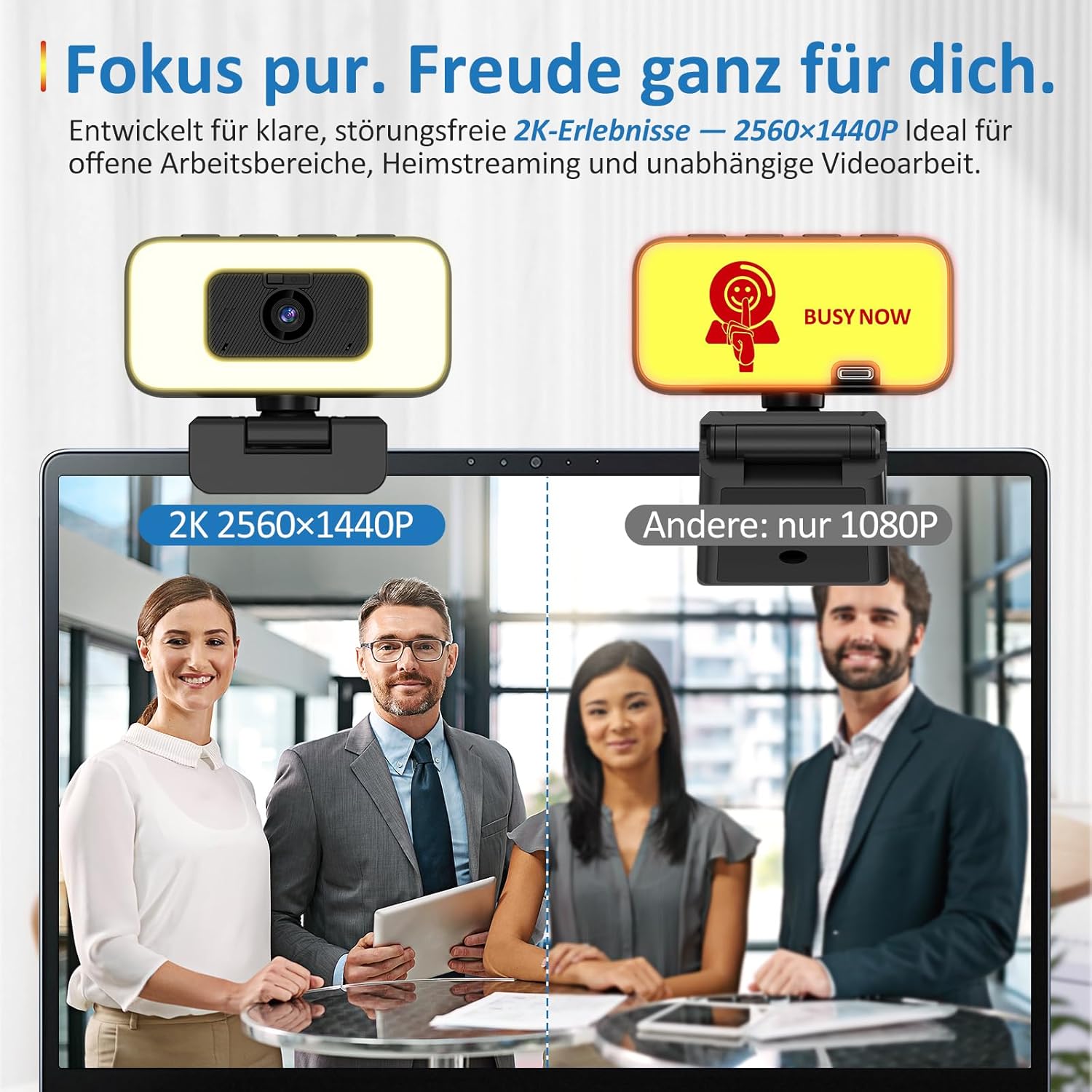 Kristallklare 2K-Auflösung für professionelle Videoanrufe: Genießen Sie gestochen scharfe Bildqualität mit der 2K-USB-Webcam – ideal für Videokonferenzen, Home-Office oder Online-Meetings. Dank des hochwertigen Sensors liefert die externe Kamera für Laptop und PC ein lebensechtes und detailliertes Bild.