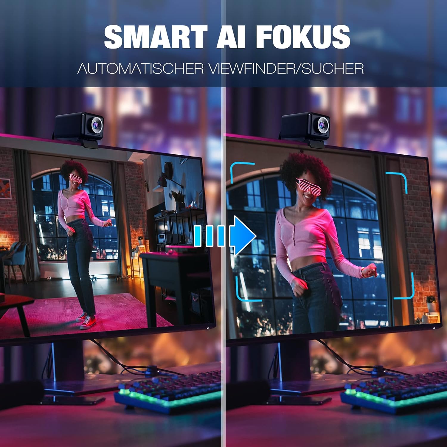 Automatische Low-Light-Korrektur und AI-Fokus: Die Webcam mit automatischer Lichtkorrektur sorgt dafür, dass Sie bei unterschiedlichen Lichtverhältnissen gut aussehen. Es ist eine gute Wahl für Leute, die in Make-up-Videos perfekt aussehen möchten. Dank der Verwendung der AI-Fokus-Technologie kann unsere HD-Webcam den Videobildschirm zoomen und eine angemessene Größe beibehalten. So müssen Sie die Webcam nicht mehr manuell anpassen und können sich besser auf Ihren Live-Stream konzentrieren.
