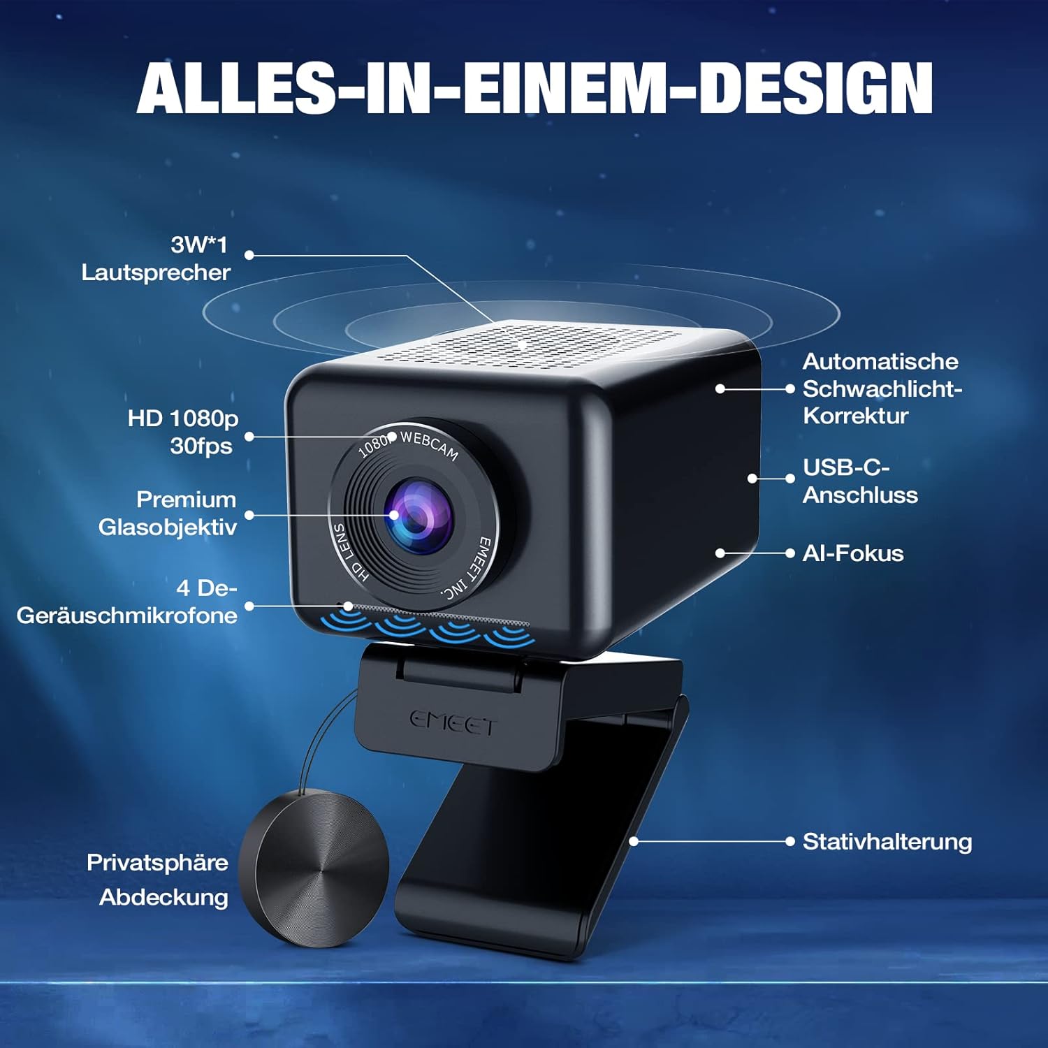 Die Webcam verfügt über 4-Mikrofon-Technologie, von denen eines Ihre Stimme optimal erfasst und das andere Umgebungsgeräusche reduziert. Gleichzeitig wurde die 1080P-Webcam mit einem eingebauten Lautsprecher ausgestattet. Die Stimme ist klar und weist keine Verzögerung auf. Durch den Tonübertragungseffekt dieser Webcam können Sie das Gefühl eines „Face-to-Face-Chats“ wirklich erleben. Mit der Full-HD-Webcam können Sie problemlos Videokonferenzen am Arbeitsplatz oder Video-Chats online durchführen. Die eMeet Jupiter AI-Webcam kann Ihre unterschiedlichen Anforderungen vollständig erfüllen.