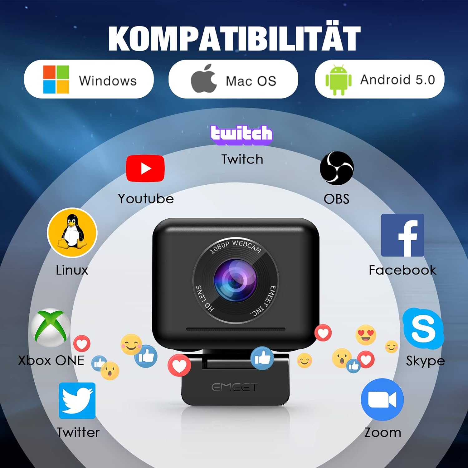 Diese 1080P-Webcam kann mit den meisten Systemen und Videosoftware verwendet werden. Zum Beispiel: Xbox ONE, Linux, OBS, Twitch, Twitter, Skype, Zoom, Youtube, Facebook, Windows XP, Windows Vista, Windows 7, 8, 10 und Mac OS X usw.