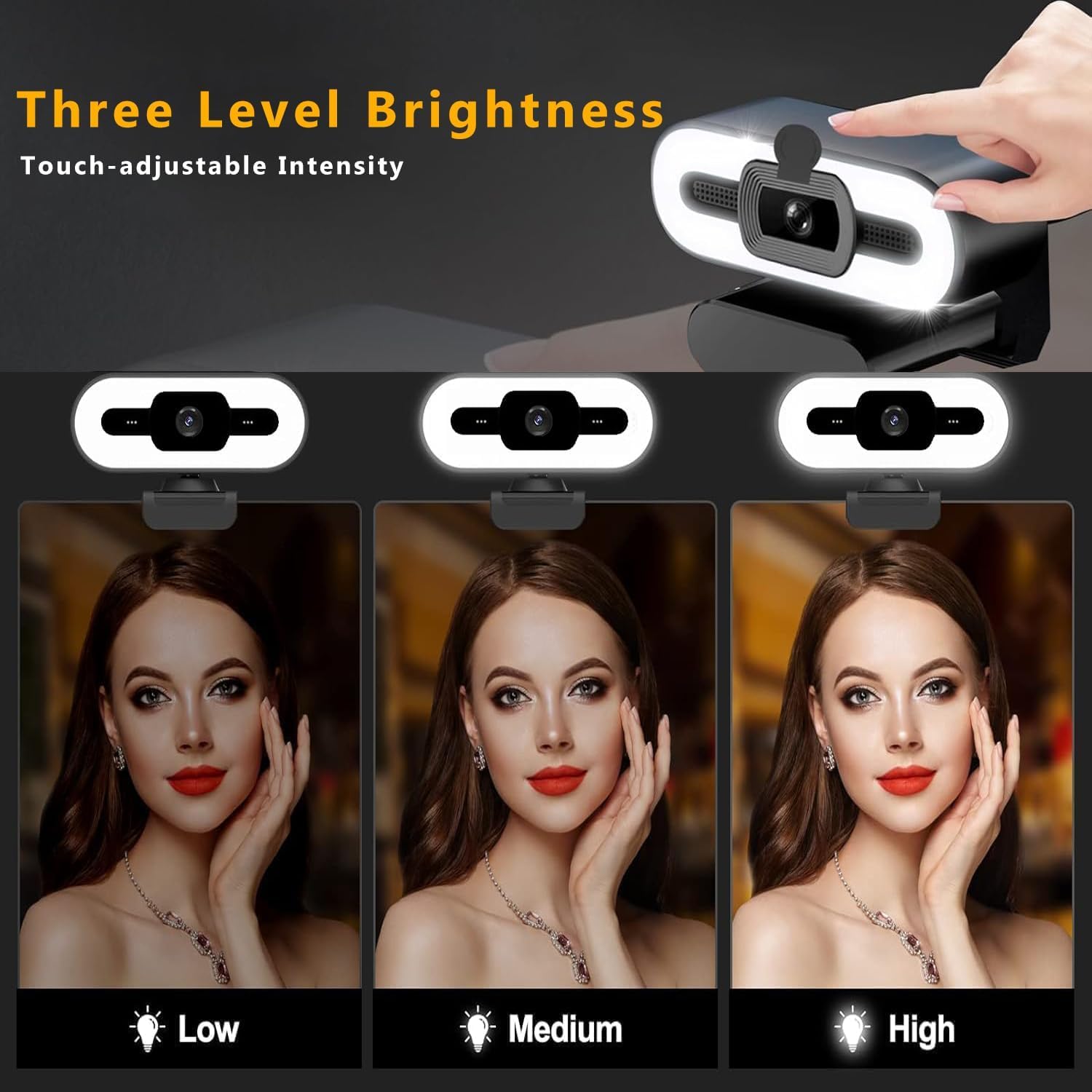 GKEAPZA Webcam mit Multifunktions-Ringlicht für bessere Porträts. Die Streaming-Webcam ist mit 3 verschiedenen LED-Farben und stufenlos einstellbarer Helligkeit ausgestattet, um helleres und weicheres Licht ohne Blendung zu bieten. Drücken Sie einfach die Touch-Taste, um die Farbtemperaturen zu ändern.