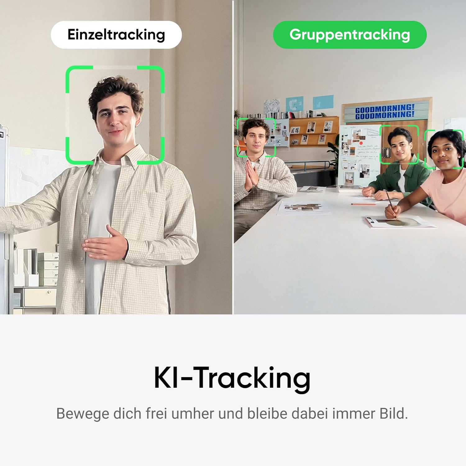 KI-Tracking: Insta360 Link 2 lässt sich physisch drehen und neigen, um Ihren Bewegungen im Raum zu folgen und Sie oder Ihre Gruppe perfekt im Bild zu halten.